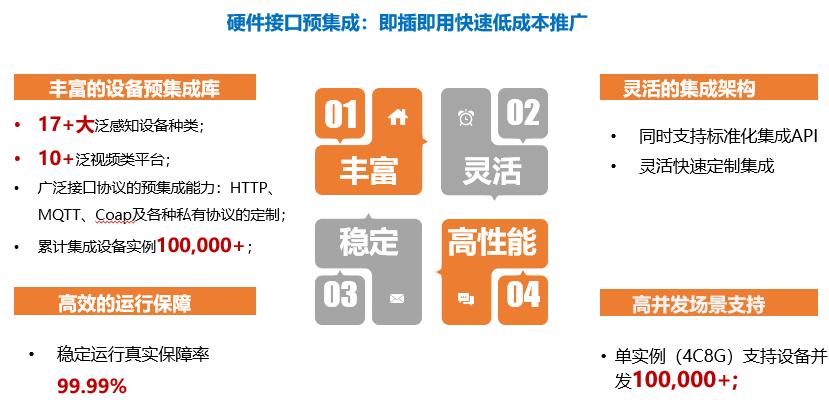 迄今350vip8888新葡的京公司已经预集成17+大泛感知设备种类,10+泛视频类平台,广泛接口协议的预集成能力涵盖了HTTP、MQTT、Coap及各种私有协议的定制,累计集成设备实例达100,000+。它还支持标准化集成API,可灵活快速地定制集成,通过构建规则引擎,实现了各设备间的联动应用,比如检测到违规停车,联动广播就会自动播报提醒,为社区管理服务赋能。